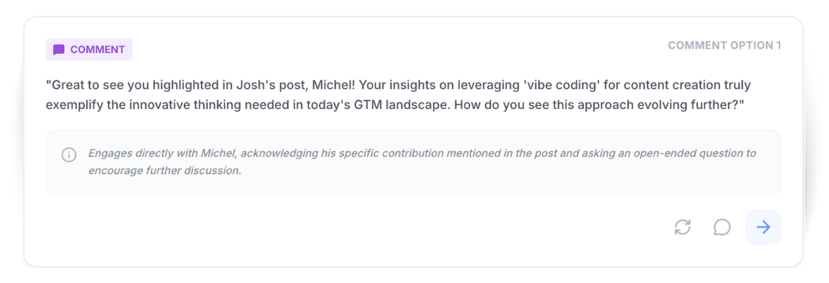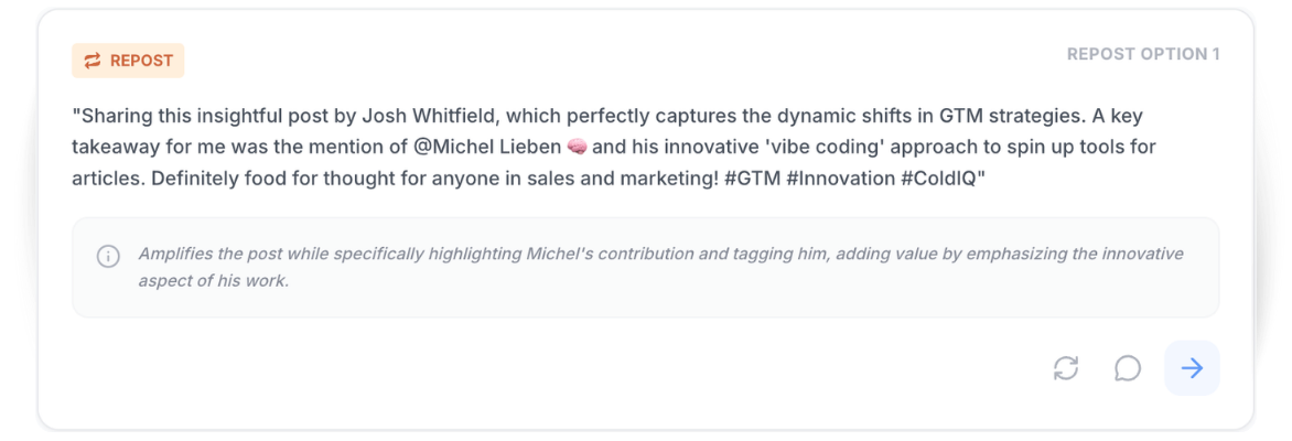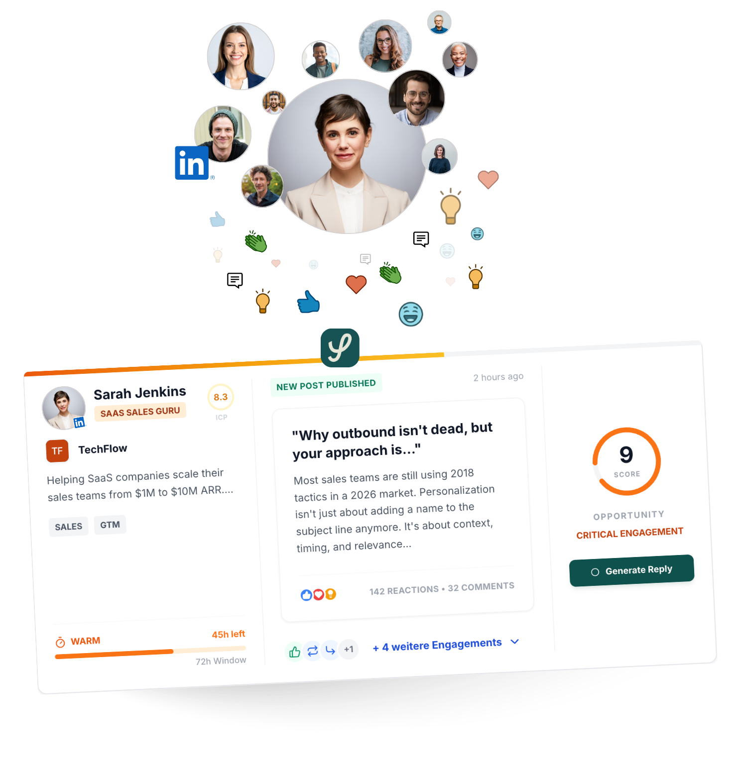 Discover what your ICP truly cares about (topics, triggers, intent signals) based on their real activity patterns, not guesses. Get ready-to-use insights and outreach angles so you can engage at the perfect moment with relevance.